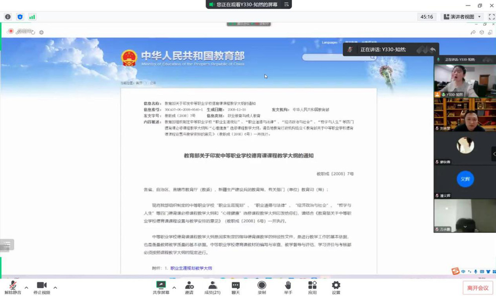 赵丹老师以教育部关于职业院校德育教学大纲的指导文件为参考,分享了教学大纲融入教育理念的重要性。表示教学大纲是指导教学活动的计划、蓝图,于学生而言承担着学习导向性作用,编写修订教学大纲不能仅仅与课本相关联,还要与学生建立起紧密联系,增强学生对职业的认同感和对集体的荣誉感。